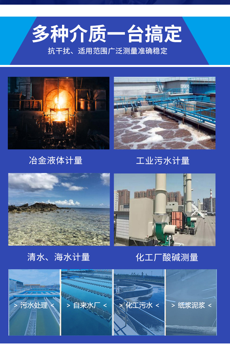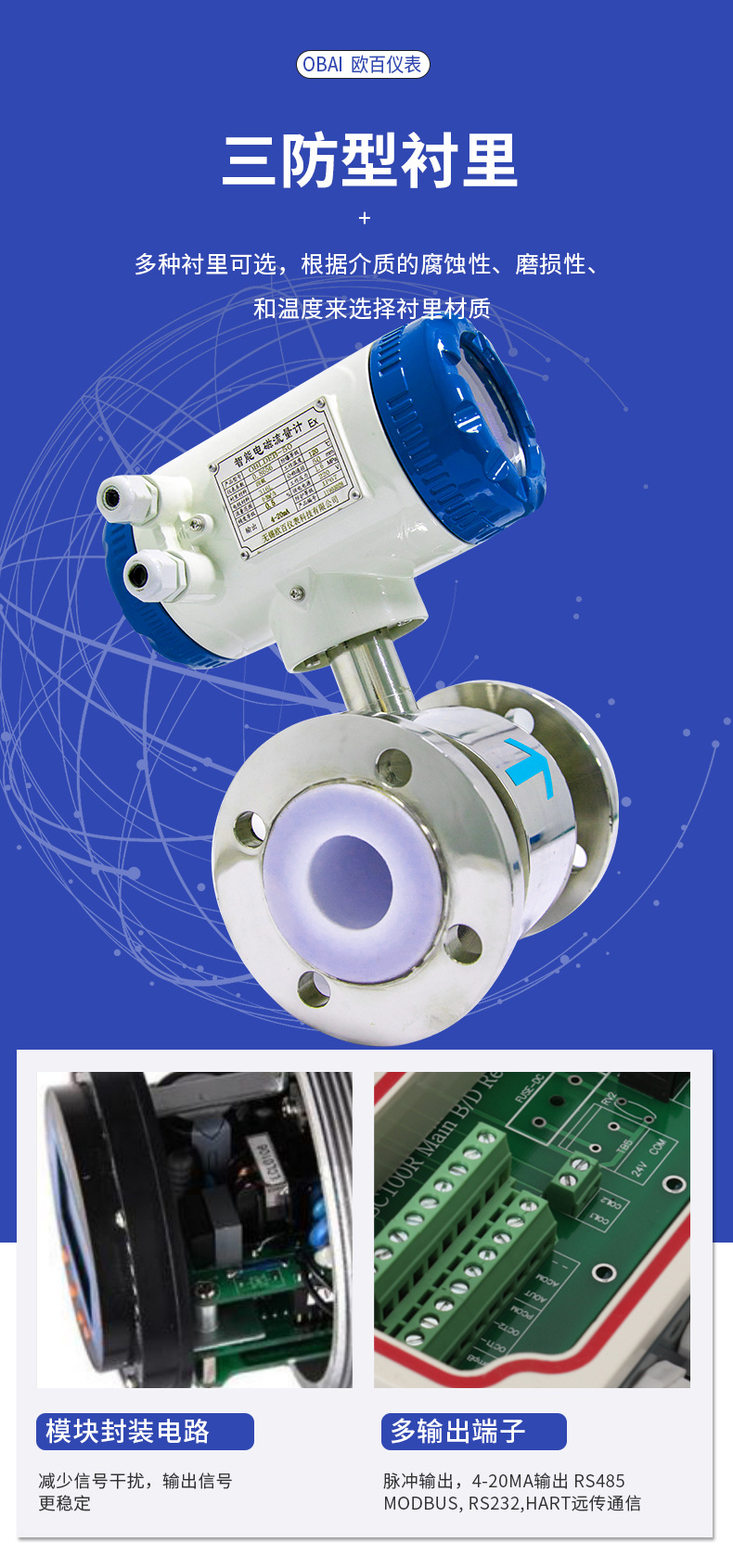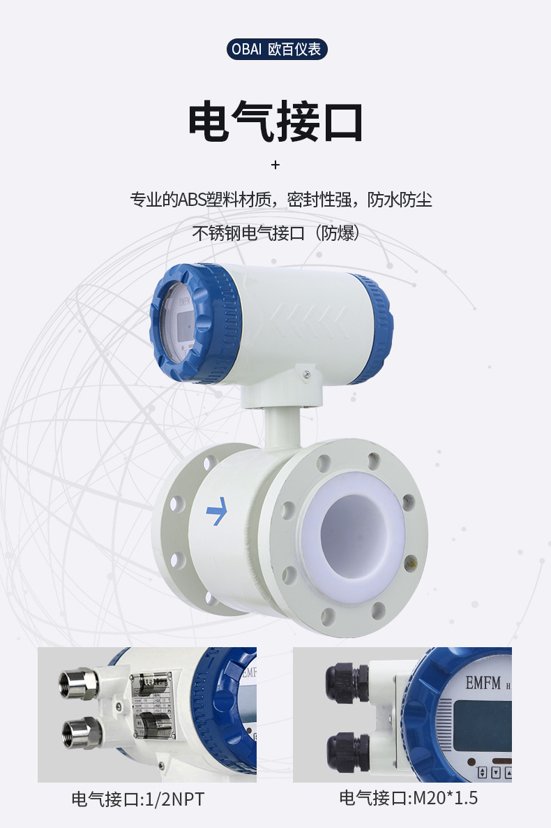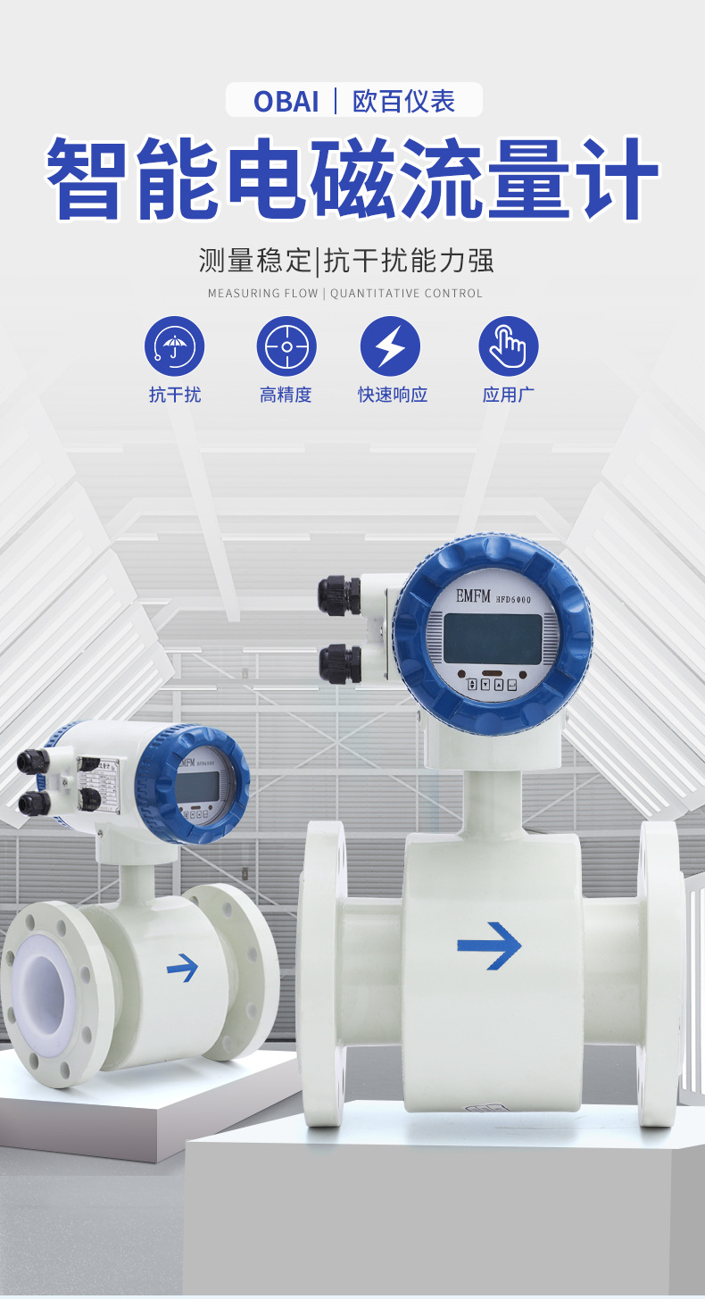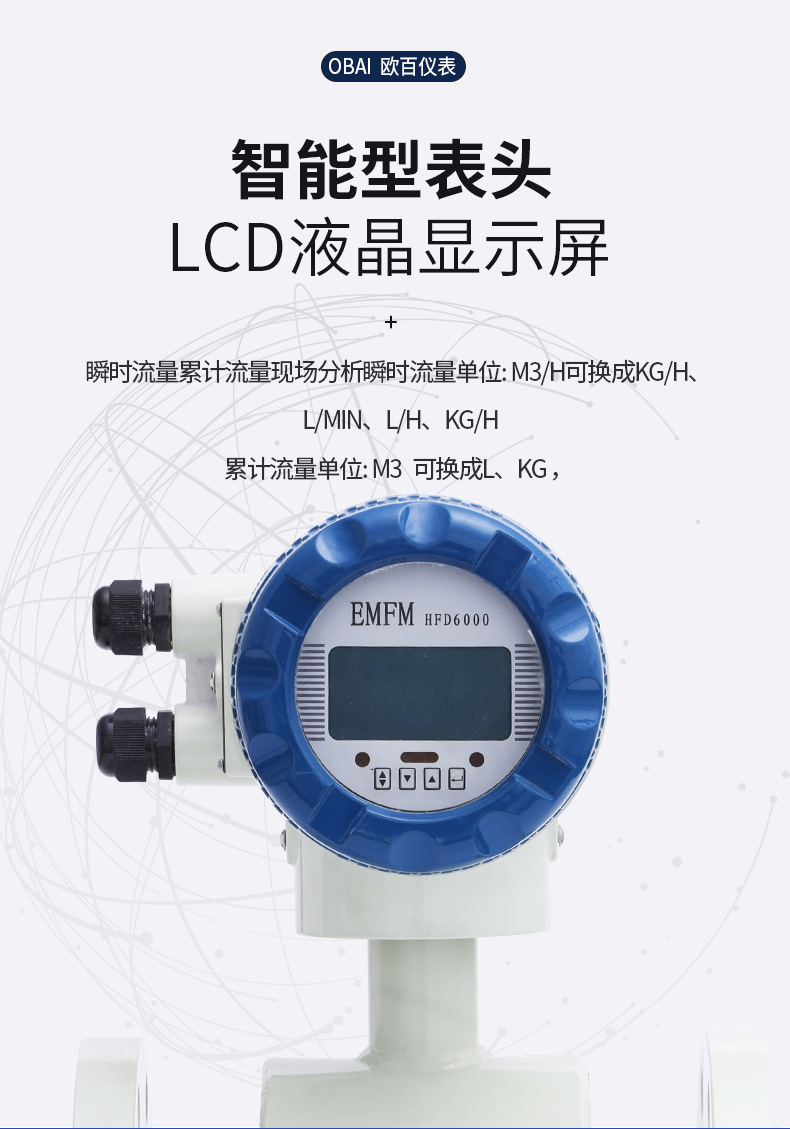 OBLDE系列電磁流量計產(chǎn)品概述OBLDE型電磁流量計適用測量封閉管道中導(dǎo)電液體和漿液的體積流量,如潔凈水、污水、各種酸堿鹽溶液、泥漿、礦漿、紙漿及食品方面的液體等。分體式配有專有的屏蔽線、可分為IP68防水型(潛水地下5米保證壽命)、遠(yuǎn)傳顯示自動抄表型、耐強酸、強堿、硫酸、硝酸、工業(yè)廢水等。